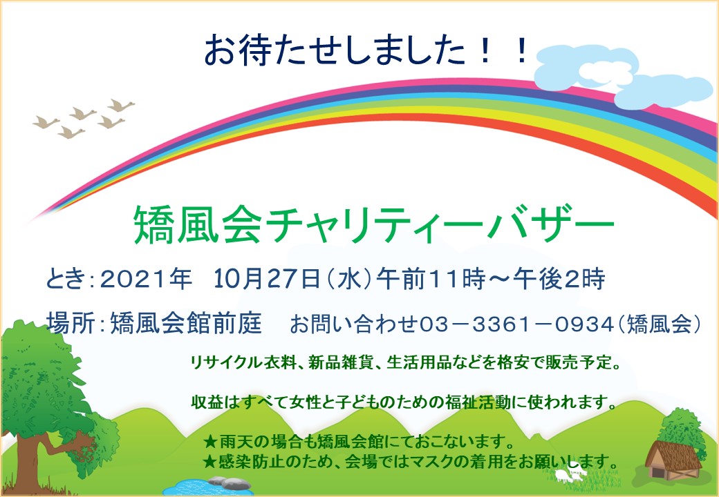 お待たせいたしました。矯風会チャリティーバザーを下記のように開催いたします。